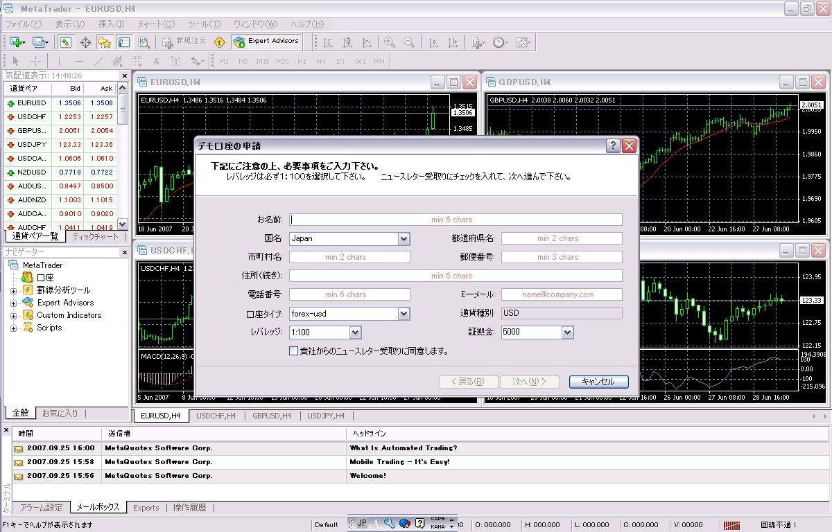 インストール直後のデモ口座登録画面