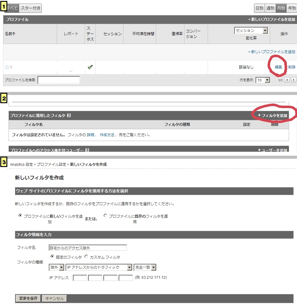 Google Analyticsで特定のIPを除外する方法。 1 プロファイル一覧から「編集」をクリック。 2 「フィルタを追加」をクリック。 3 新しいフィルタを追加 という項目がでるのでそこから自由に設定可能です。